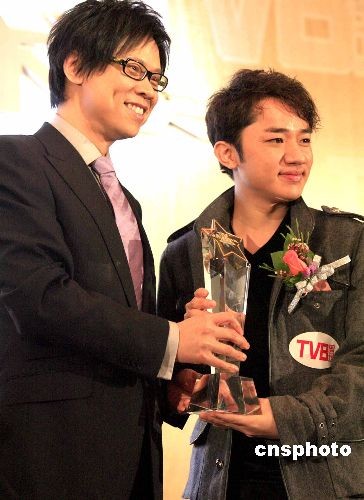 十二月十七日,《TBV周刊》2008最強(qiáng)人氣品牌大獎頒獎禮在香港舉行。圖為無線電視總經(jīng)理陳志云(左)為2008最強(qiáng)人氣廣告新人王王祖藍(lán)頒獎。中新社發(fā) 張勤 攝