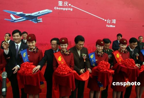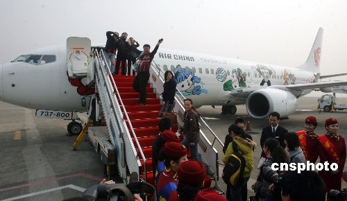 12月19日,重慶至臺北的直航航線正式開通。當(dāng)日下午3時許,印有福娃圖案的國航班機從重慶江北機場起飛,駛向?qū)殟u臺灣。中新社發(fā) 郭晉嘉 攝