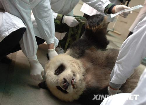 12月20日,醫(yī)務(wù)人員對大熊貓“小明”實施全身麻醉后進行檢查。新華社記者 陳鋼 攝