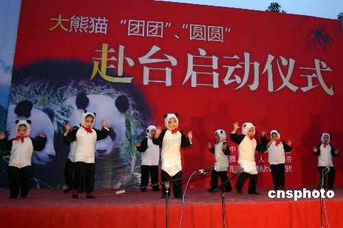 12月23日是贈臺大熊貓“團(tuán)團(tuán)”、“圓圓”飛赴臺灣的日子,“團(tuán)團(tuán)”“圓圓”離開四川,雅安民眾舉行了熱烈的歡送儀式。圖為當(dāng)?shù)氐摹靶茇垖殞殹北硌菸璧浮缎茇埱椤。中新社發(fā) 霍潺 攝