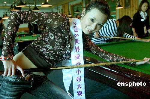 12月23日,正在北京參加2008世界亞裔小姐大賽中國區(qū)總決賽的佳麗在嘉年華游樂園游覽拍照,各種游樂項(xiàng)目吸引佳麗。圖為參賽佳麗練習(xí)打臺球。中新社發(fā) 錢興強(qiáng) 攝