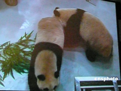 大陸贈臺大熊貓“團(tuán)團(tuán)”“圓圓”二十三日晚間抵達(dá)臺北的新家——臺北市立動物園新光特展館。圖為“團(tuán)團(tuán)”和往常一樣,喜歡跟在“圓圓”身后,如影隨形。