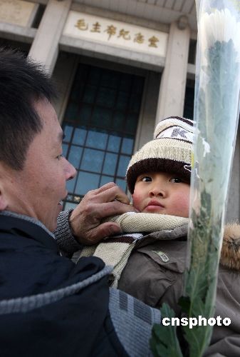 12月26日毛澤東115周年誕辰日清晨,一名四川地震災區(qū)的三歲男童與父親到位于北京天安門廣場的“毛主席紀念堂”敬獻白菊鮮花,深切懷念偉大領袖毛主席。
