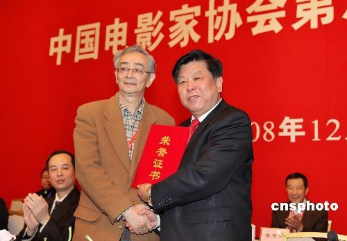 中國(guó)文聯(lián)黨組書(shū)記胡振民給著名導(dǎo)演吳貽弓頒發(fā)榮譽(yù)證書(shū)。