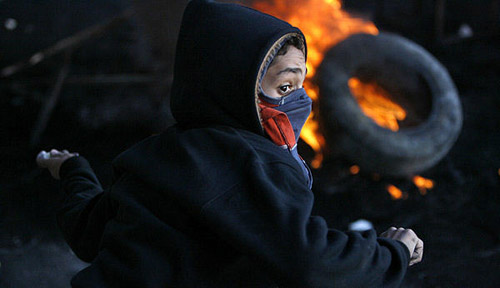12月28日,在耶路撒冷的一個(gè)難民營(yíng),一名巴勒斯坦男孩向以色列士兵投擲石子,以表達(dá)對(duì)以色列空襲的抗議。以色列當(dāng)日繼續(xù)對(duì)加沙地帶進(jìn)行空襲,空襲已造成上千人傷亡。