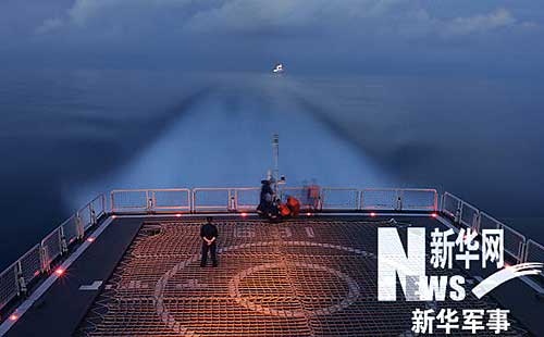 12月28日夜,中國赴亞丁灣、索馬里海域護(hù)航編隊(duì)首次組織夜間直升機(jī)行進(jìn)間著艦訓(xùn)練。張朋 攝