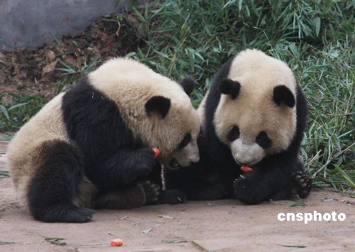 兩只幼熊貓在雅安碧峰峽熊貓基地熊貓幼兒園吃食物。 中新社發(fā) 郭國權(quán) 攝