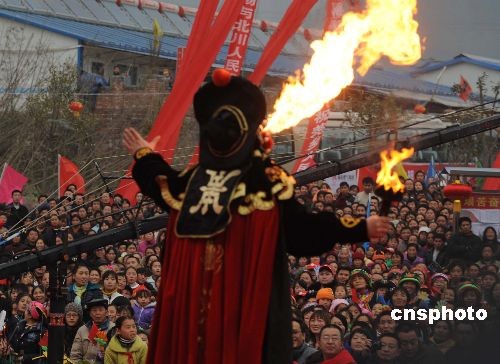 12月31日,川劇著名變臉演員在四川地震極重災(zāi)區(qū)的擂鼓鎮(zhèn)板房區(qū)前,展示噴火技藝慰問北川縣上萬民眾干部,以迎元旦文藝表演告別難忘的2008年。中新社發(fā) 賈國榮 攝
