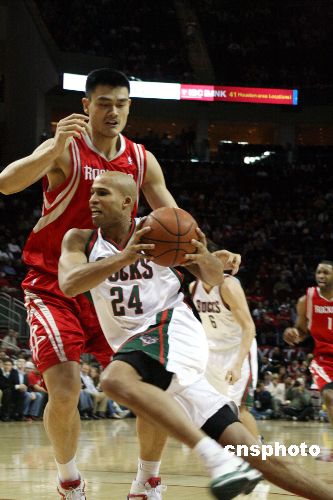 當(dāng)?shù)貢r(shí)間12月31日晚,火箭在主場以85-81苦戰(zhàn)過關(guān)擊敗雄鹿,姚明拿下了22分10個(gè)籃板!≈行律绨l(fā) 歐文 攝