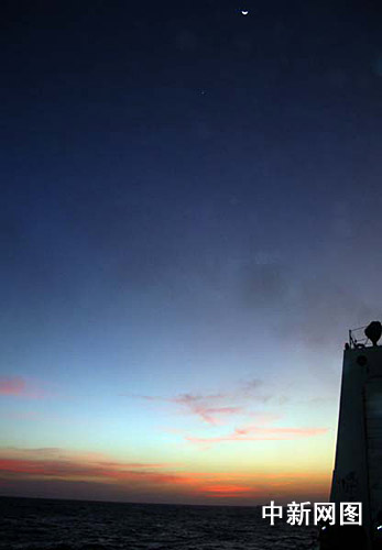 1月2日,中國(guó)海軍護(hù)航艦艇編隊(duì)繼續(xù)在印度洋航行,圖為航行途中在“?凇迸炆纤臄z的印度洋晚霞映月景觀。 中新網(wǎng)記者 孫自法 攝