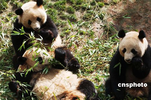 三只來自地震災(zāi)區(qū)四川臥龍的熊貓寶寶思嘉、美茜、芊芊,經(jīng)過云南野生動(dòng)物園半年的精心照料,已適應(yīng)當(dāng)?shù)氐臍夂颦h(huán)境,成長健康,與園內(nèi)原有的兩只大熊貓歡歡和南南共同迎接新年的到來。