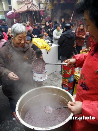 2009年1月3日,農(nóng)歷臘月初八,是中國(guó)傳統(tǒng)的臘八節(jié),湖北宜昌三峽古佛寺里準(zhǔn)備了豐盛的臘八粥,眾多名市民在古佛寺里喜吃臘八粥。據(jù)悉,臘八粥又稱佛粥,與佛祖釋迦牟尼得道成佛有關(guān)。臘八粥在民間被視為吉祥食品,寓意一年之末的大豐收及來年風(fēng)調(diào)雨順,吉祥如意。中新社發(fā) 劉君鳳 攝