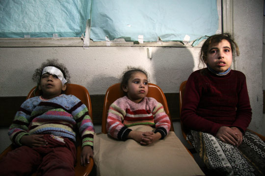 在以色列攻襲加沙中受傷的巴勒斯坦女孩在醫(yī)院外等候。6日,以色列部隊攻擊了聯(lián)合國在加沙地區(qū)設(shè)立的學校,造成數(shù)十人死亡。