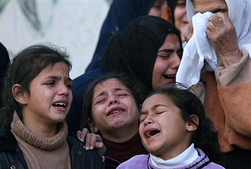 巴勒斯坦人7日大規(guī)模悼念因以色列空襲聯(lián)合國學(xué)校被炸死的民眾,悼念活動(dòng)現(xiàn)場擺放著其中43人的尸體。共有48人在空襲中喪生。