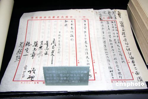 1月7日,中國國民黨中央黨部黨史展覽廳在此間推出“跨越三世紀(jì)——中國國民黨的變與不變”展覽,展出許多珍貴史料,包括周恩來的手稿。圖為1946年,周恩來為新華日?qǐng)?bào)營業(yè)部遭搗毀事,致函當(dāng)時(shí)的國民政府主席蔣介石的手稿。中新社發(fā) 陳立宇 攝