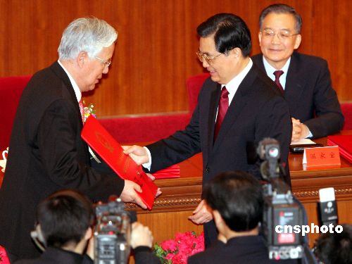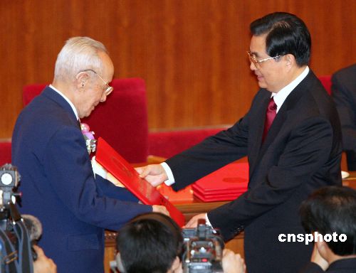 胡錦濤為徐光憲頒發(fā)國家最高科學(xué)技術(shù)獎。中新社發(fā) 宋吉河 攝