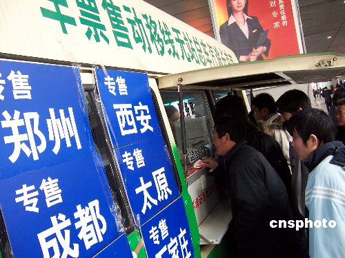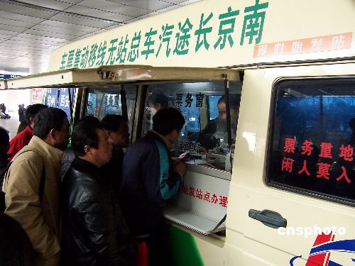 2009年1月10日,旅客在南京市一輛流動(dòng)售票車前排隊(duì)購(gòu)買春運(yùn)汽車票。春運(yùn)來臨,江蘇省南京市交通運(yùn)輸部門在車站廣場(chǎng)和市區(qū)繁華路段設(shè)立了流動(dòng)售票車,既緩解了車站集中售票的人流壓力,又使旅客體驗(yàn)到了春運(yùn)購(gòu)票的便捷。中新社發(fā) 王啟明 攝