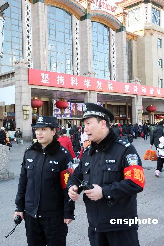 1月11日,2009年春運正式開始,北京警方啟動“服務旅客、平安春運”活動,為旅客發(fā)放安全提示卡,張貼海報介紹購票、乘車等出行注意事項,確保市民度過一個安全、快樂的春節(jié)。中新社發(fā) 任海霞 攝