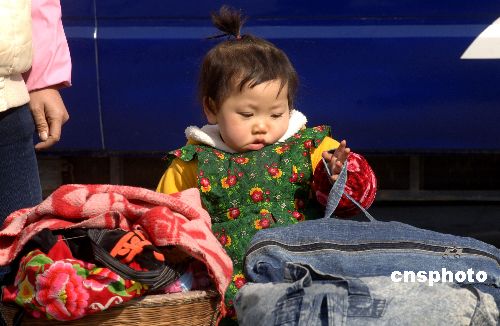 圖為小女孩在福州火車站護守行李。