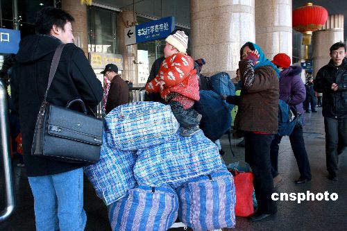 1月11日,為期40天的中國2009年春運正式開始,春運客流壓力依然很大,客流的剛性需求特征十分明顯,預計全國鐵路旅客發(fā)送量將達1.88億人,比去年同期增長8%,日均470萬人,春運“一票難求”的問題仍突出。圖為北京西站的客流不斷。
