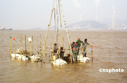1月12日9時30分許,4名大橋施工員在浙江省臺州市海門港椒江二橋建設工地上測量時,被上漲的潮水困在港內(nèi)工地上。接到報警后,臺州邊防支隊迅速派遣公邊艇前往營救,經(jīng)過近1個時努力,4人終于成功脫險。中新社發(fā) 郟策 攝