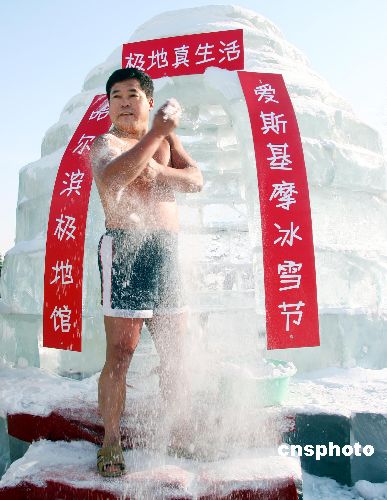 1月12日,“功夫海象”趣味擂臺(tái)賽在哈爾濱極地館再敲戰(zhàn)鼓,打破吉尼斯世界耐寒紀(jì)錄的“冰人”金松浩也參加其中。他與“功夫海象”耶娃在冰冷刺骨的海水中耐寒比拼長達(dá)一個(gè)多小時(shí)。最叫絕的是金松浩躺在零下30多度的冰床上與“功夫海象”一起比試仰臥起坐,這樣的場面令人驚嘆不已。來自哈市的6個(gè)家庭及松花江冬泳隊(duì)的6名成員也與“功夫海象”耶娃展開激烈角逐。他們在哈爾濱極地館的“愛斯基摩村”里爬冰堡、拉爬犁;三九天在戶外大口大口吃冰棍、啃凍梨、嚼冰糖葫蘆。真是笑傲冰雪,妙趣橫生。中新社發(fā) 姚庭山 攝