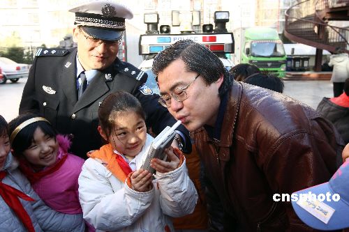 1月14日,北京崇文區(qū)交通支隊民警為崇文小學學生和家長講授交通安全課,家長當場向自己的孩子簽署交通安全承諾書,承諾在節(jié)日期間不酒后駕車、不闖紅燈、不疲勞駕駛,與孩子度過安全、快樂的假期。圖為小學生學習用酒精監(jiān)測儀測試自己的家長。中新社發(fā) 杜洋 攝