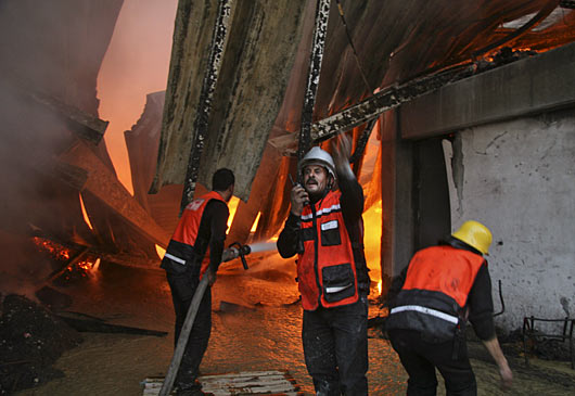 1月15日,巴勒斯坦消防人員為遭以軍炮擊后起火的聯(lián)合國駐加沙的辦公機(jī)構(gòu)滅火。