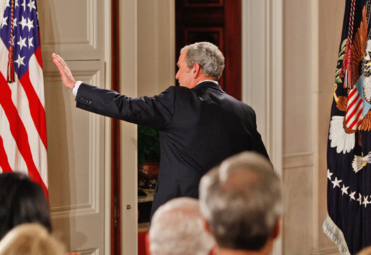 北京時(shí)間2009年1月16日,布什在白宮進(jìn)行告別演說后,揮手告別。