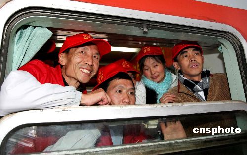 福建省首趟農(nóng)民工返鄉(xiāng)專列(福州—成都)1月15日11時38分啟程。在福建省總工會、中國移動福建公司、南昌鐵路局福州辦事處等多個部門的關(guān)心下,來自四川、陜西等地的650多名在閩務(wù)工人員,乘坐由福州開往成都的K392次列車踏上返鄉(xiāng)過年之旅。其中20名家在四川地震災(zāi)區(qū)的農(nóng)民工還獲得免費車票。中新社發(fā) 楊婀娜 攝