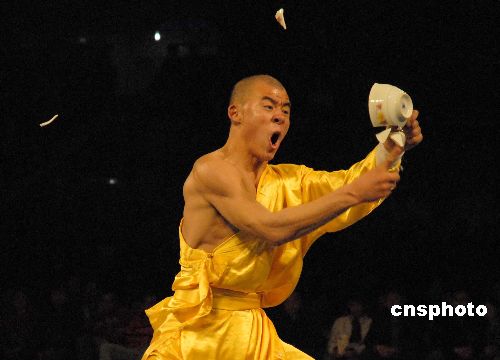 圖中武僧用一根手指連破十來個瓷碗,令觀眾嘆為觀止。中新社發(fā) 劉冉陽 攝