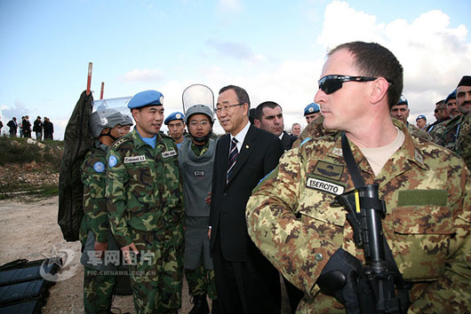 黎巴嫩當(dāng)?shù)貢r(shí)間17日,正在中東進(jìn)行外交斡旋的聯(lián)合國(guó)秘書(shū)長(zhǎng)潘基文在視察聯(lián)合國(guó)駐黎巴嫩維和部隊(duì)時(shí),專(zhuān)程前往藍(lán)線接見(jiàn)了中國(guó)赴黎維和工兵營(yíng)掃雷官兵。