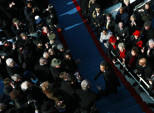 圖:奧巴馬走進(jìn)就職典禮現(xiàn)場 全場歡呼