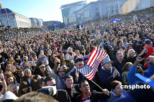 舊金山人們?cè)谑姓畯V場(chǎng)同步觀看美國(guó)第四十四任總統(tǒng)奧巴馬就職典禮。中新社發(fā) 陳鋼 攝