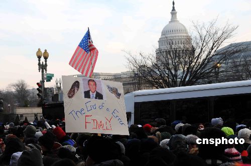 圖為在國家大草地的觀禮民眾打出布什被扔鞋的窘相并寫著:“錯誤的最后終結(jié)”!中新社發(fā) 邱江波 攝