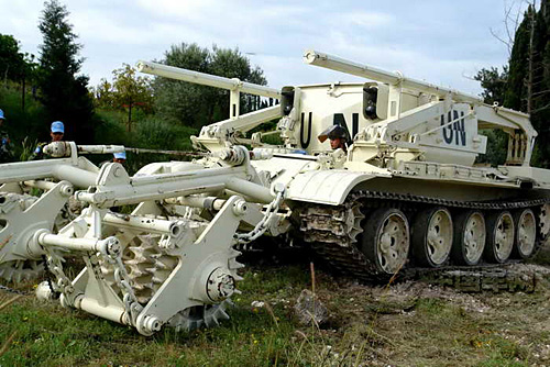 該掃雷車可配有爆破掃雷器、機(jī)械掃雷器和電子掃雷器三種,通過爆破、打碾、翻排、推壓雷區(qū)土地等方法,提高掃雷速度,降低掃雷成本,減少觸雷傷亡人員。在行軍狀態(tài)下,發(fā)動機(jī)功率427千瓦,掛裝掃雷犁公路最大行駛速度47千米/小時。