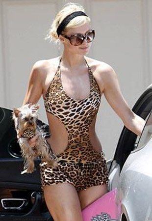 愛出風(fēng)頭的帕麗斯·希爾頓不僅要把自己打扮得漂漂亮亮,就連她的寵物狗也不放過。帕麗斯外出時(shí)穿上一套性感的豹紋裝,并給她的寵物狗也穿上了一件同款豹紋裝,上面還帶有一條黑色的蕾絲裙邊,十分搶眼。