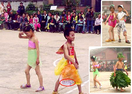 幾名小學(xué)生穿著有創(chuàng)意的服裝,利用廢舊報(bào)紙、綠葉等做成服裝道具,在一簡(jiǎn)陋的校園操場(chǎng)上學(xué)著模特的貓步行走,淳樸天真的表演贏得了許多網(wǎng)友跟帖喝彩,稱“除了能宣傳環(huán)保,還能鍛煉、啟發(fā)孩子”,不過也有人并不認(rèn)可。