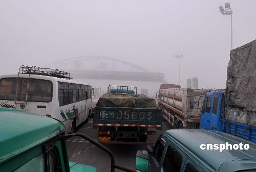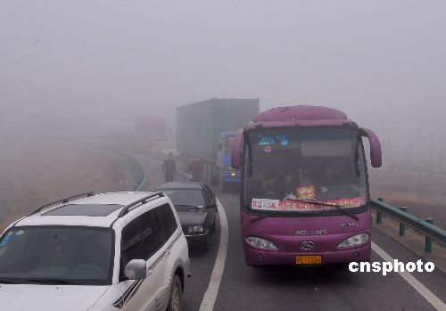 1月22日,受北方南下冷空氣與當(dāng)?shù)嘏瘽駳饬鹘粎R影響,當(dāng)天清晨5時(shí)左右起,安徽滁州遭受大霧襲擊,境內(nèi)寧洛、滬陜、京臺(tái)高速能見度在50至100米,嚴(yán)重影響春運(yùn)期間的交通安全。大霧期間,滁州高速交警對(duì)轄區(qū)所有高速入口全部實(shí)行暫時(shí)封閉,在增派干警加大路面巡邏力度的同時(shí),還安排警車引導(dǎo)車輛行駛。截至上午10時(shí)左右,濃霧逐漸散去,所有高速道口實(shí)行了間段放行。中新社發(fā) 王家國(guó) 攝