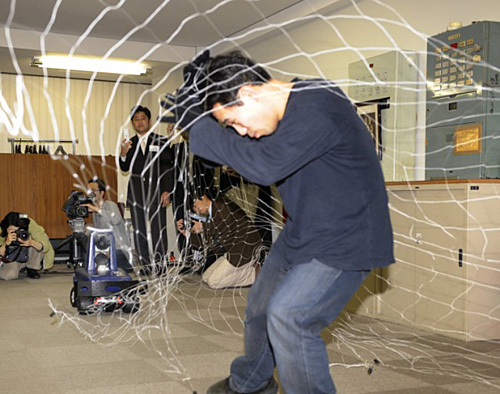據(jù)英國媒體報道,日本一公司近日展示了一款保安機器人。這款改進型保安機器人裝有新型傳感器,可以自動發(fā)射網(wǎng)狀物將竊賊套住,并將現(xiàn)場圖像發(fā)到主人的手機上。