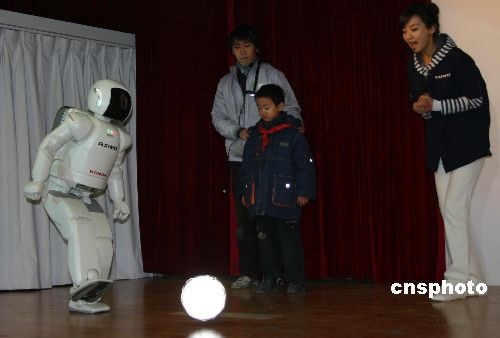 會踢球的機(jī)器人:世界上最先進(jìn)的類人型機(jī)器人ASIMO,在四川都江堰進(jìn)行了一場足球射門表演。中新社發(fā) 黃永莉 攝