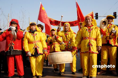 1月26日,山東費縣18鄉(xiāng)鎮(zhèn)新農(nóng)村文藝演出隊進城串街表演,他們自編自演精彩的舞獅、舞龍、高蹺、秧歌等傳統(tǒng)民間節(jié)目,將黨的惠農(nóng)政策和新農(nóng)村建設(shè)成果融入演出中,與城里人一同歡慶新春佳節(jié),自由抒發(fā)新年豐收喜悅。中新社發(fā) 劉 濤 攝