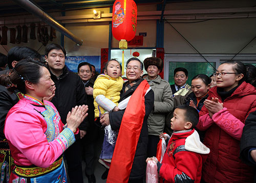 1月24日至25日,中共中央政治局常委、國務(wù)院總理溫家寶來到四川受災(zāi)最為嚴(yán)重的北川、德陽、汶川等地,和災(zāi)區(qū)人民一起過年。這是1月25日,溫家寶在汶川映秀鎮(zhèn)板房安置小區(qū)與群眾一起過年。作者:姚大偉