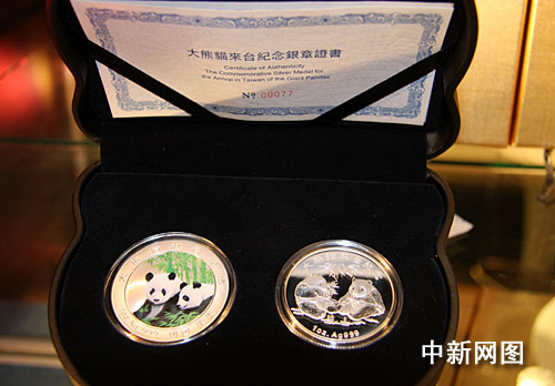 為紀(jì)念大熊貓團(tuán)團(tuán)、圓圓來(lái)臺(tái)與民眾見面。位于臺(tái)北市和平東路三段68——1號(hào)的臺(tái)灣大洋金銀幣有限公司特委請(qǐng)深圳國(guó)寶鑄幣廠和臺(tái)灣“中央鑄幣廠”鑄造大熊貓赴臺(tái)紀(jì)念銀章和大熊貓來(lái)臺(tái)紀(jì)念銀章各一枚供臺(tái)灣民眾選購(gòu)。中新社記者 陳立宇 攝