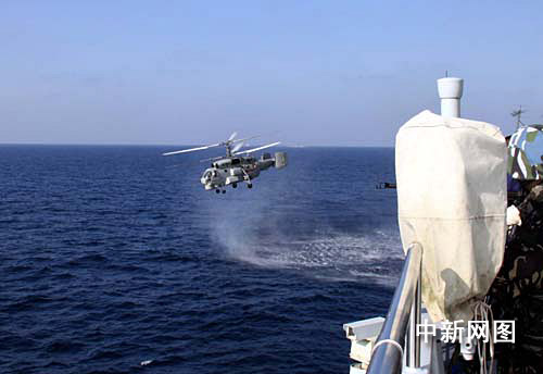 中新網(wǎng)“?凇迸瀬喍1月31日電 當(dāng)?shù)貢r(shí)間1月29日上午,中國(guó)海軍護(hù)航編隊(duì)“?凇碧(hào)導(dǎo)彈驅(qū)逐艦數(shù)名特戰(zhàn)隊(duì)員由艦載直升機(jī)滑降到被護(hù)香港“鵬程”號(hào)商船上,執(zhí)行“?凇迸灥谝淮螌(shí)施的隨船護(hù)衛(wèi)行動(dòng)。圖為直升機(jī)從“?凇迸炂痫w奔赴被護(hù)香港商船。