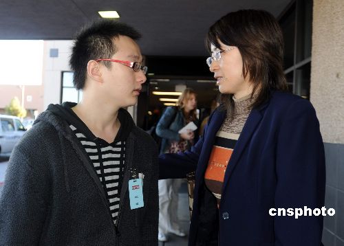 當(dāng)?shù)貢r(shí)間一月三十一日下午,中國駐洛杉磯副總領(lǐng)事黃曉健(右)在內(nèi)華達(dá)大學(xué)醫(yī)療中心和中國游客小洪(左)交談。小洪是沒有參加大峽谷一日游而躲過一劫的五名中國游客之一,而小洪的父母受傷嚴(yán)重,尤其是母親傷勢危重。中國游客當(dāng)?shù)貢r(shí)間一月三十日下午在美國亞利桑那州的九十三號公路上遭遇嚴(yán)重車禍,造成七人遇難、十人受傷。中新社發(fā) 張煒 攝