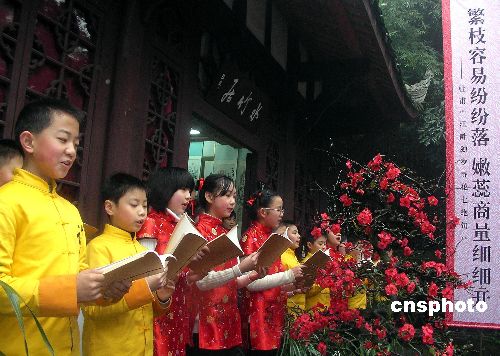 圖為來(lái)自成都草堂小學(xué)的百名小詩(shī)童齊誦杜甫與高適唱和的詩(shī)作,一表心中敬意。中新社發(fā) 楊杰 攝