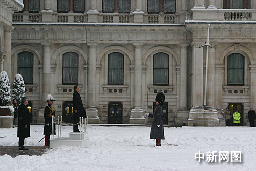 倫敦當?shù)貢r間二月二日上午八時三十分許,正在對英國進行正式訪問的中國總理溫家寶,踏雪出席布朗首相在外交部舉行的歡迎儀式。圖為溫家寶在觀禮臺上檢閱儀仗隊。 中新社記者 張朔 攝