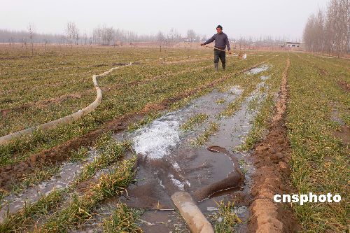 2月3日下午,開封市仙人莊村農(nóng)民在田間澆灌小麥。面對嚴(yán)重的旱情,河南省開封市各縣區(qū)積極組織群眾迅速行動,做好以抗旱澆麥為重點的麥田管理工作,力爭今年夏糧豐收。