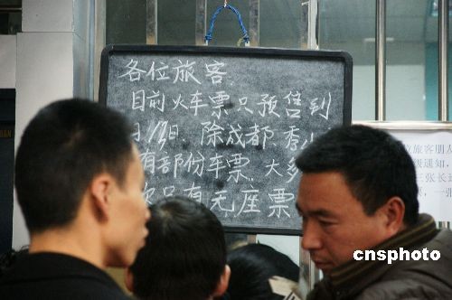 2009年2月4日,旅客在重慶市一火車票代售點(diǎn)排隊(duì)買票。當(dāng)日,重慶迎來節(jié)后客流最高峰,車票已預(yù)售至13日,除發(fā)往成都、秀山方面的火車還有部分余票外,其他車次均為無(wú)座票。中新社發(fā) 姜純 攝